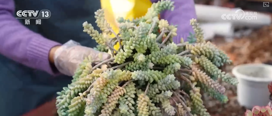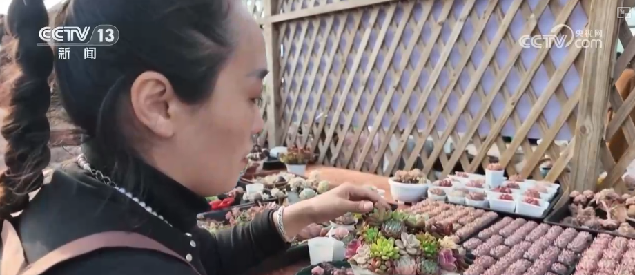 除了大花蕙兰,2025年当地还开发了多种构思花卉产品。在一家花卉基地的园艺大棚内,园艺师用不同的多肉植物制造成构思盆栽,招引了不同年龄段的顾客咨询、下单。