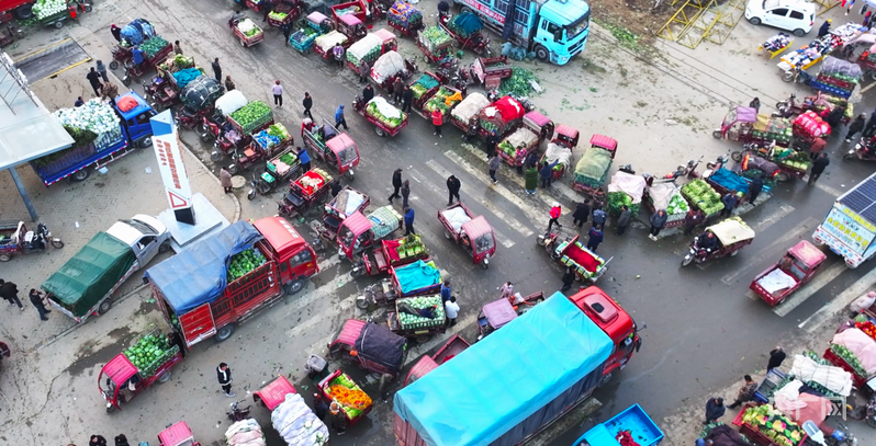 袁庄村的蔬菜批发商业商场是这片丰盈图景的中心舞台。每天清晨,晨露还未散失,商场内已灯火通明、人声鼎沸。称重、计价、装车的声响此伏彼起,买卖双方的讨价还价声交织成一曲共同的“清晨集市交响曲”。菜农们拉着满满一车带着泥土芳香的鲜蔬赶来,一筐筐蔬菜规整堆放,既承载着农户的生计期望,也凝聚着四季的勤劳汗水。